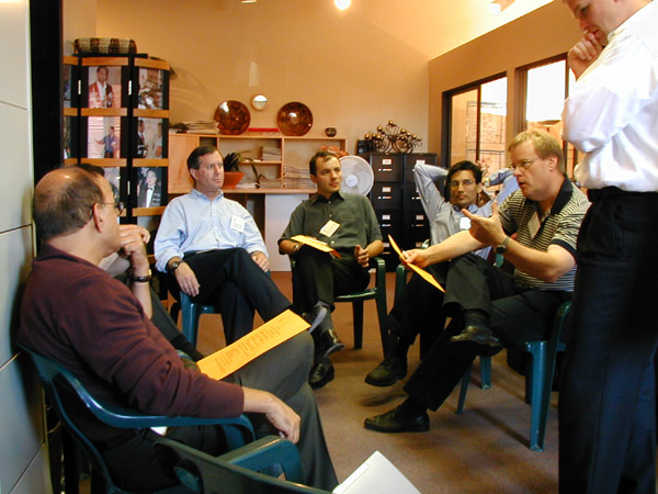 Photos/157.jpgCommonGoal partner Horst Lehrheuer makes a point to iSphere's Jeff Mantel, Strategies, Concepts & Solutions Lab's Drdjan Kovacevic and Rajiv Gupta of Corporate Oxygen in a breakout session at the September 25 Think Tank Session on Web Services. |