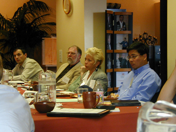 Photos/164.jpgDr. Srdjan Kovacevic of Strategies, Concepts and Solutions Labs, Dr. Rodney Heisterberg of Rod Heisterberg Associates, Kitty Wells of Customer Intelligence Agency, Inc., and Dr. Kuo-Wei Hwang of IBM listen to UPS's presentation on how they have solved customer-facing problems around dynamic information integration at the Center on September 27, 2002. |